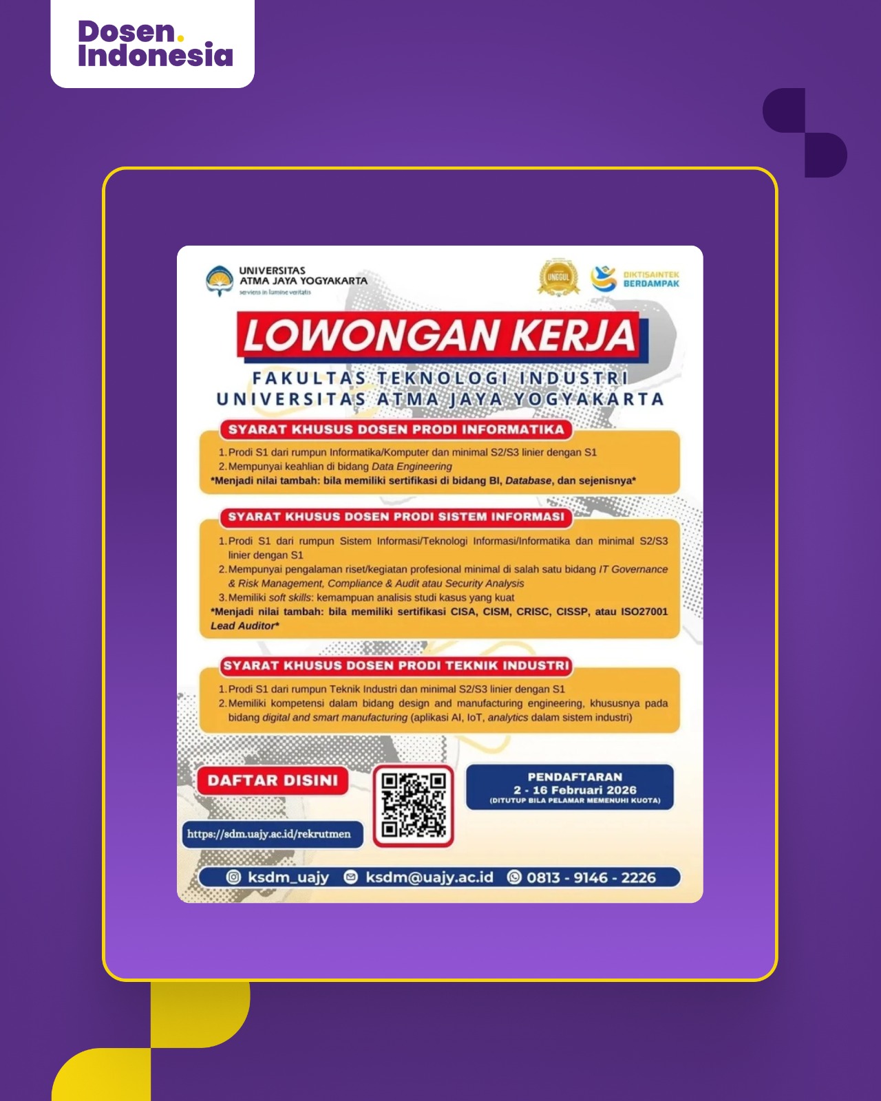Rekrutmen Dosen S1 Kecerdasan Artifisial & Sains Informasi